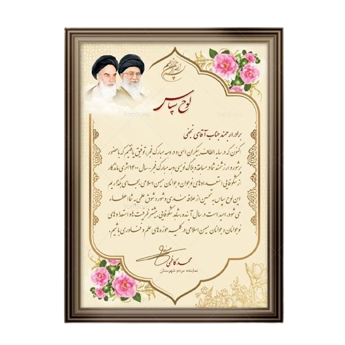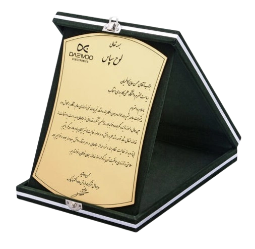 نوع ارائه: معمولاً داخل کاور مقوایی یا فولدر مخصوص لوح تقدیر قرار میگیرد تا جلوه شکیلتری پیدا کند.